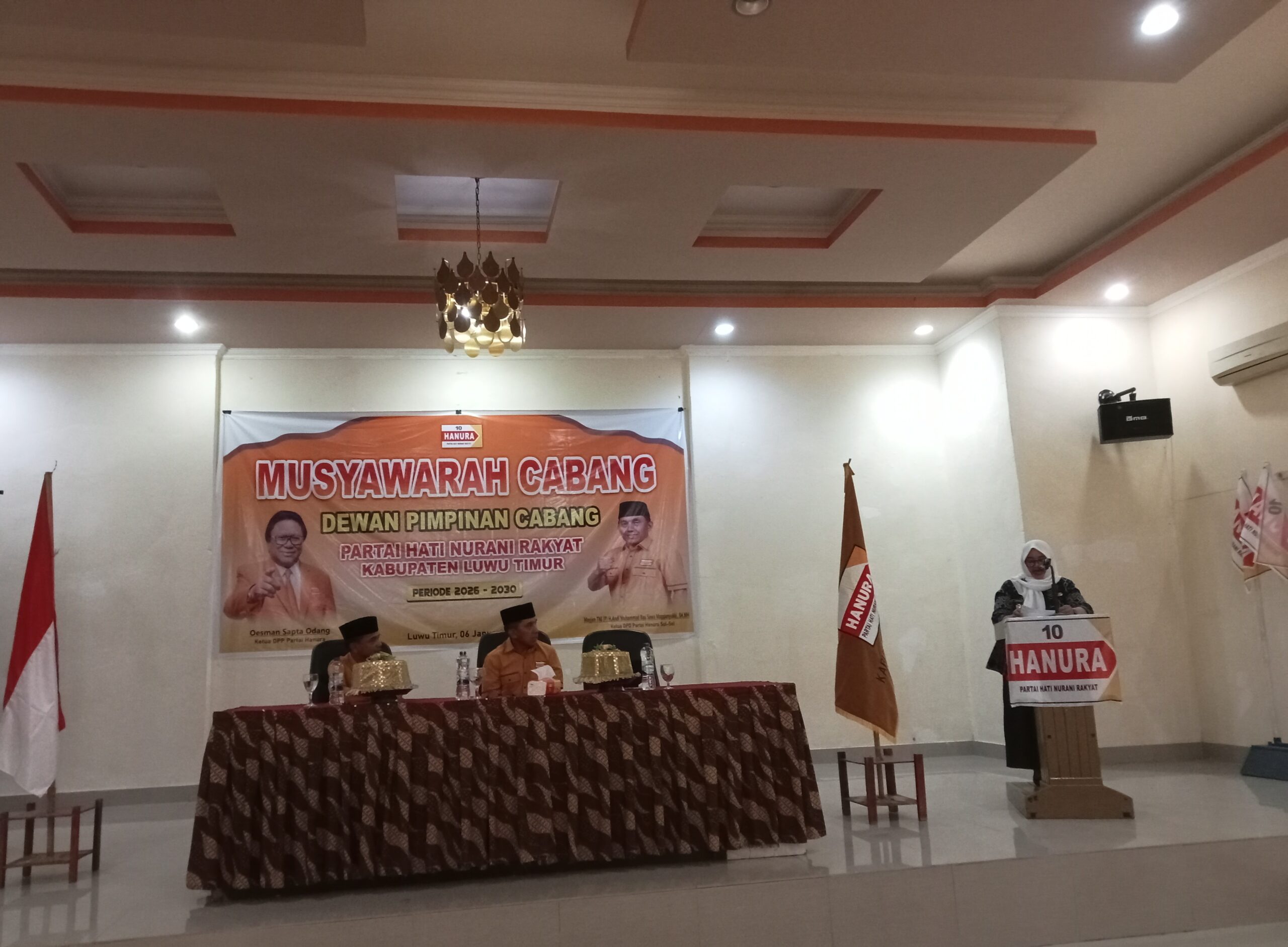 Adapun agenda utama Muscab ditandai dengan penyerahan bendera pataka Partai Hanura oleh Ketua DPD Provinsi Sulawesi Selatan kepada Ketua DPC Partai Hanura Kabupaten Luwu Timur yang terpilih secara aklamasi, Aprianto, S.Kep masa bakti 2026-2031.